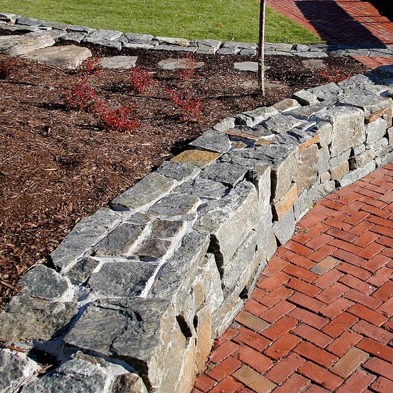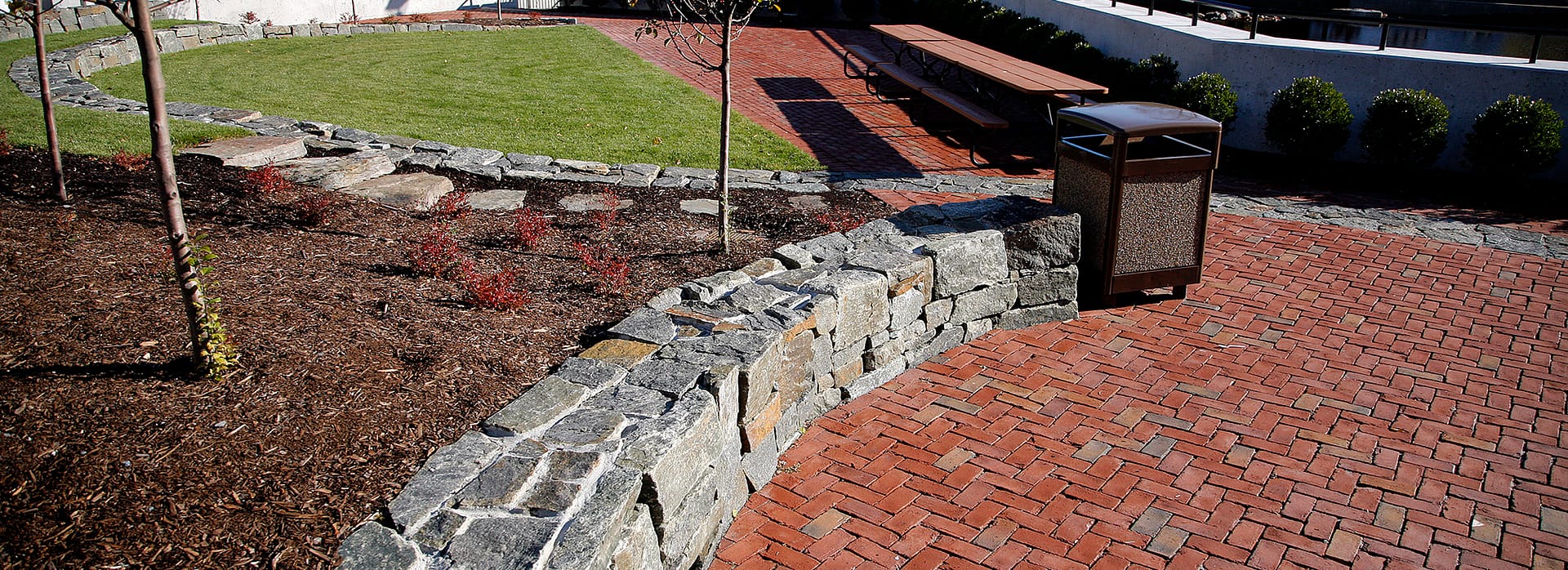 Black Mountain Granite retaining walls and pathway, and Pennsylvania fieldstone stepper pathway at the Ipswich Mills Historic District redevelopment. The granite pathway is integrated into a brick courtyard and transitions into a retaining wall that invites walking and seating. Pennsylvania fieldstone steppers invite further exploration.