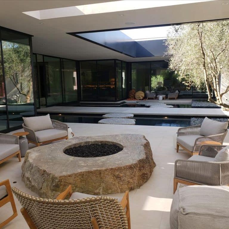 When something totally unique is part of the design custom fabrication is the only way to go. Boulders can be sawn to produce many different products. The flat, sawn surfaces are functional and the natural boulder surfaces enhance the designs. Rest assured, these products cannot be duplicated. This giant fire table with sawn stepping stones is stunning in a patio setting.