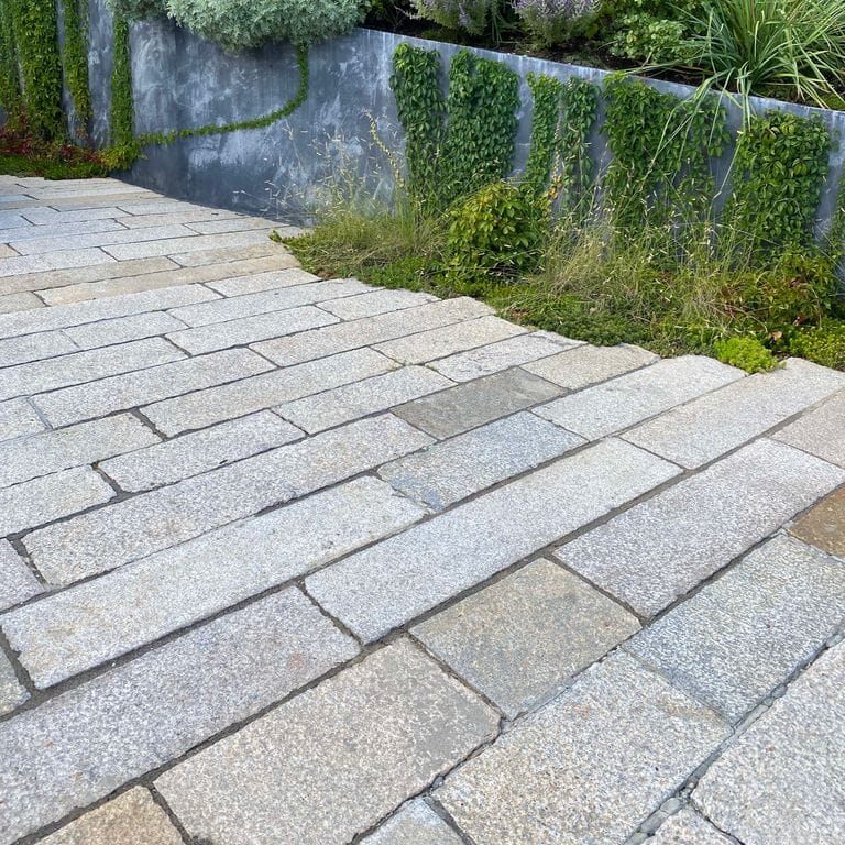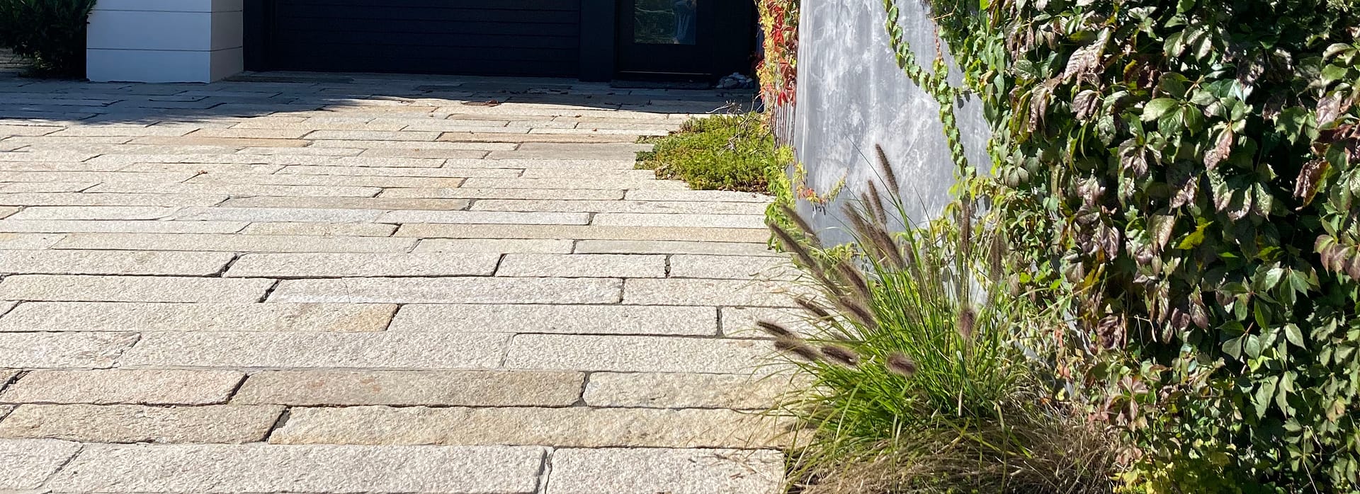 Reclaimed footworn plank paver driveway and walkway. Ancient granite paving stones are a brilliant contrast to this modern home. The planks show centuries of wear and weathering and also function as a skid resistant surface.