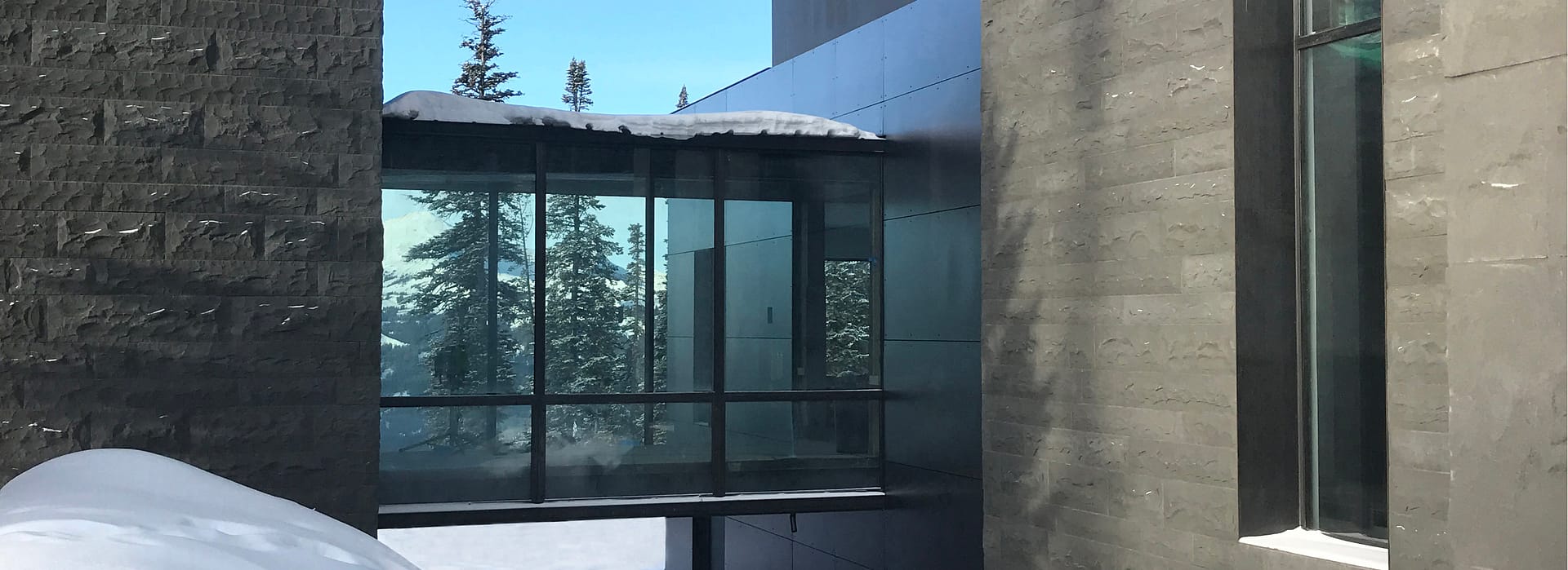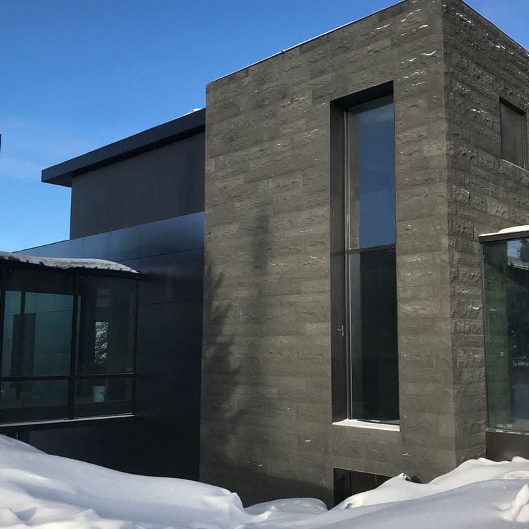 Stone is the perfect building siding in this mountain environment. The dark gray basalt is paired with black metal and charred wood elements. The look is modern and blends perfectly with its surroundings. An amazing design to be sure.
