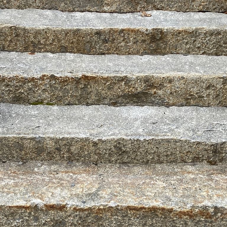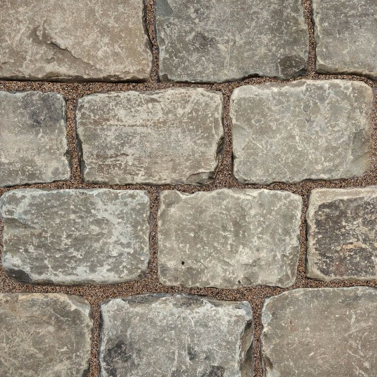 Reclaimed natural edge plank paver driveways, pathways and landing with reclaimed European sandstone cobblestone accent detail; reclaimed weathered riser and tread steps; reclaimed granite manhole casing.
