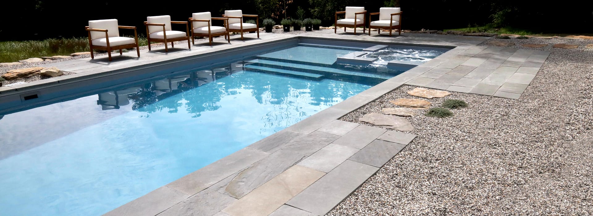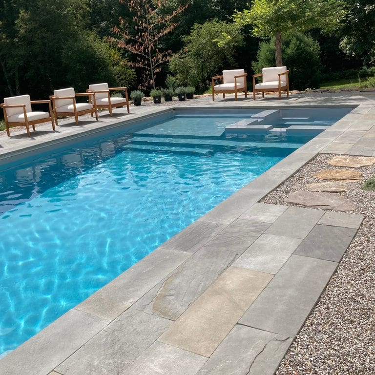 Natural cleft bluestone dimensional cut pool deck with self-capping coping provides contrast to a beautiful rustic county home in Princeton, Massachusetts.