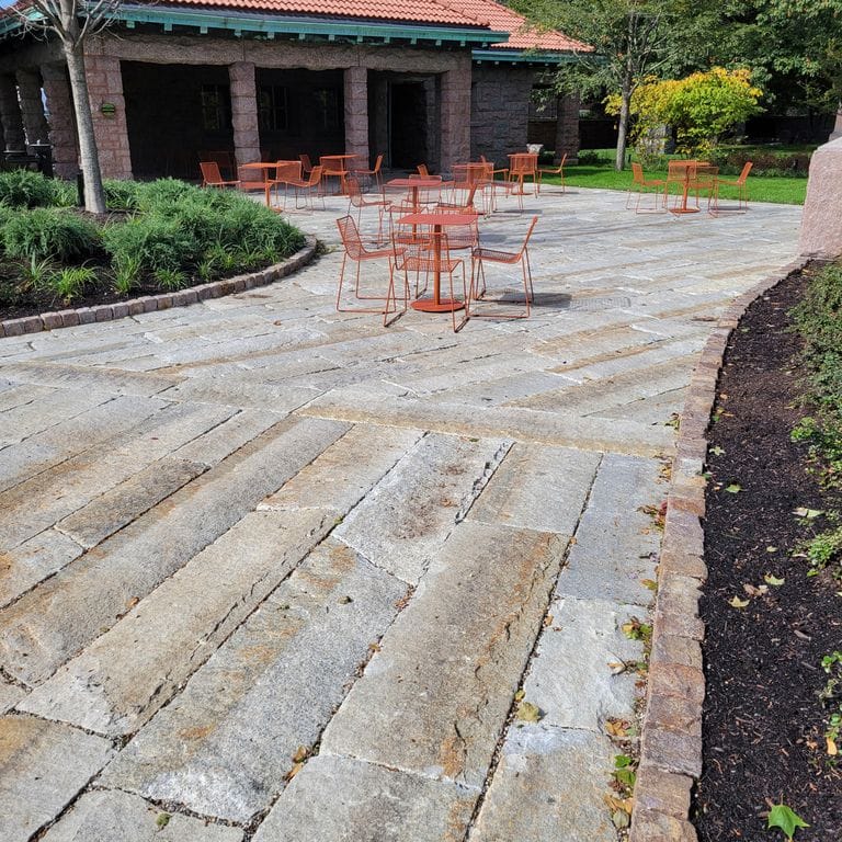 In rebuilding the entrance to Chicago’s Graceland Cemetery, a key challenge was to use stones that would maintain the subdued sense of history mixed with a welcoming beauty. Using Reclaimed Granite Curbstone not only fulfills the vision but serves as a poignant reminder of the past for this new entrance to this space—along with a newly installed metalwork arch. The cemetery, on Chicago’s North Side, is the final resting place for many well-known Chicagoans of yesteryeas including baseball player Ernie Banks, boxer Jack Johnson, railroad engineer and industrialist George Pullman, and department store magnate Marshall Field, among others.