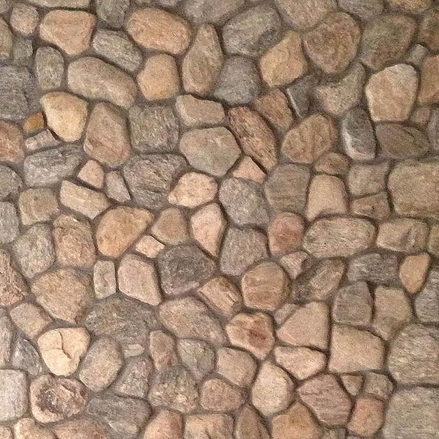 North American water-worn river/beach stone. This stone can have a smooth to rough texture. Dominant colors are brown, orange/rust and tan; with a beige secondary. The color mix creates a warm feeling. Regular color pattern. This is a building and landscape stone for indoor and outdoor commercial and residential applications. Relatively moderate in price.