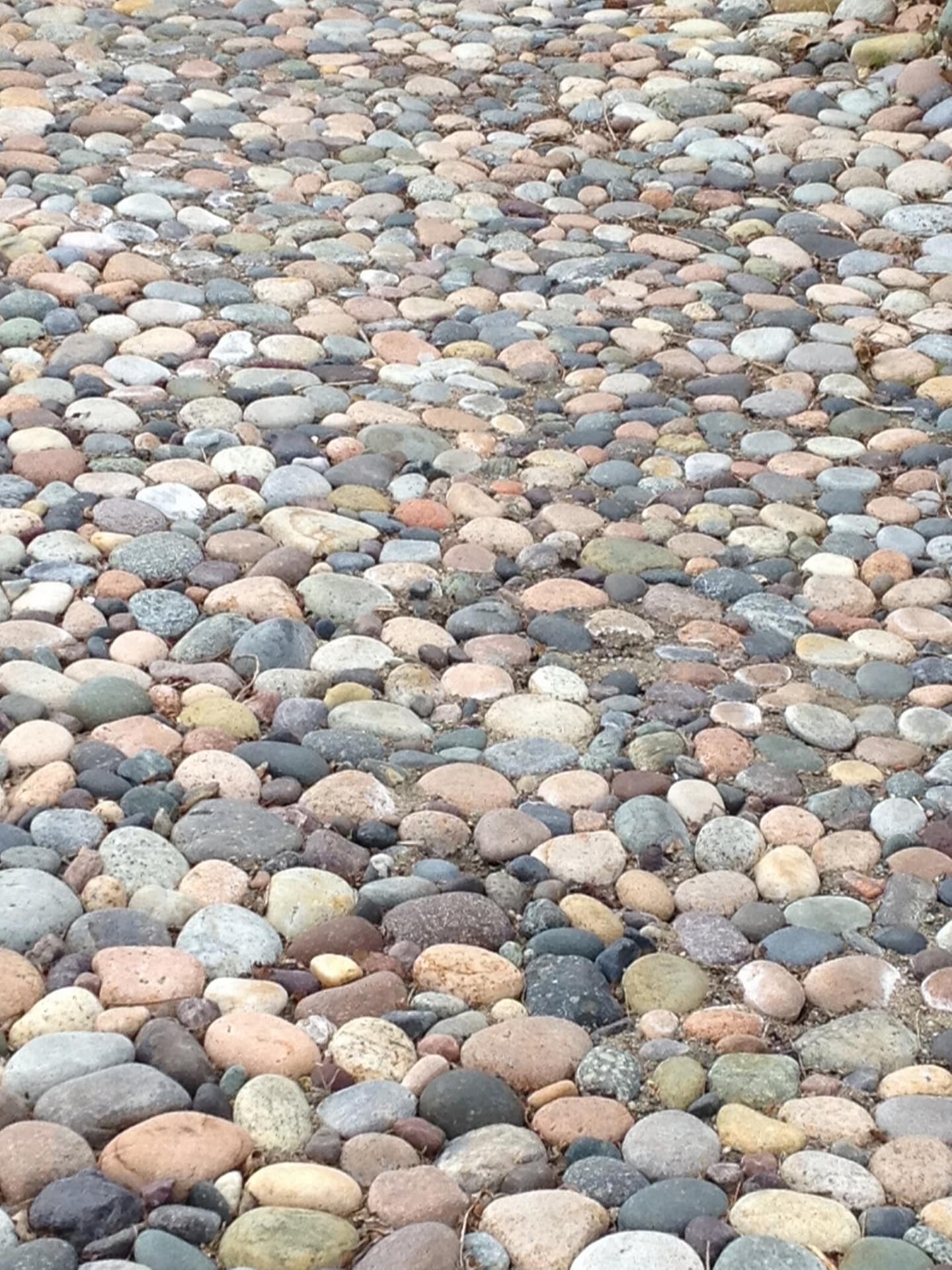 North American water-worn river/beach stone. This stone can have a slick to rough texture. Dominant colors are beige, gray and tan; with blue, brown, green, orange/rust, pink, purple, white and cream secondaries. The color mix creates a warm feeling. Regular, random, speckled, coarse speckled and blotched color patterns. This is a building and landscape stone for indoor and outdoor commercial and residential applications. Relatively moderate in price.