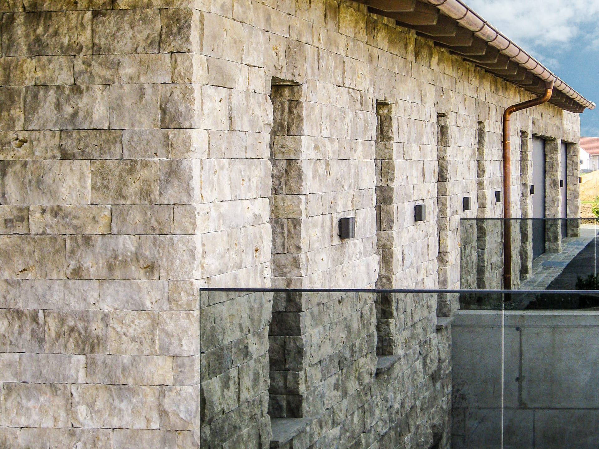 A quarried European limestone natural stone from Germany. This stone can have a slick to rough texture. Dominant colors are beige and gray; with blue, white, tan and cream secondaries. Exhibits “movement” and the color mix creates a cool feeling. Random, blotched and cloudy color patterns. Contains voids and mineral inclusions. This is a building and landscape stone for indoor and outdoor commercial and residential applications. Relatively moderate in price.