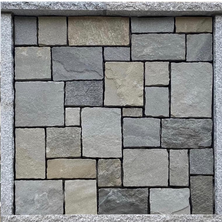 A quarried Asian quartzite natural stone. This stone can have a somewhat rough to very rough texture. The dominant color is gray; with beige, black, blue, brown, green and purple secondaries. The color mix creates a cool feeling. Regular color pattern. This is a building and landscape stone for indoor and outdoor commercial and residential applications. Relatively higher in price.